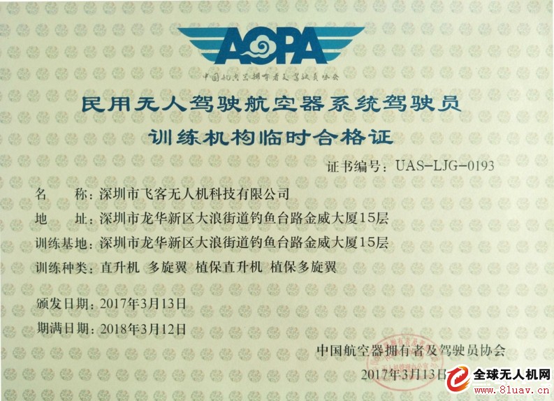 | 發(fā)證機(jī)構(gòu): | 中國航空器擁有者及駕駛員協(xié)會 | 發(fā)證時間 : | 2017-03-13 |